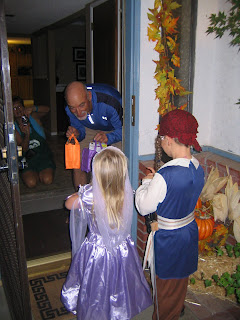 Then spent the night at my parent's house and had tghe kids dress up in their costumes to trick or treat at Nono and Nini's early since they would miss it on Monday. My Mom pulled Caleb into the bathroom and gave him his first beard.
